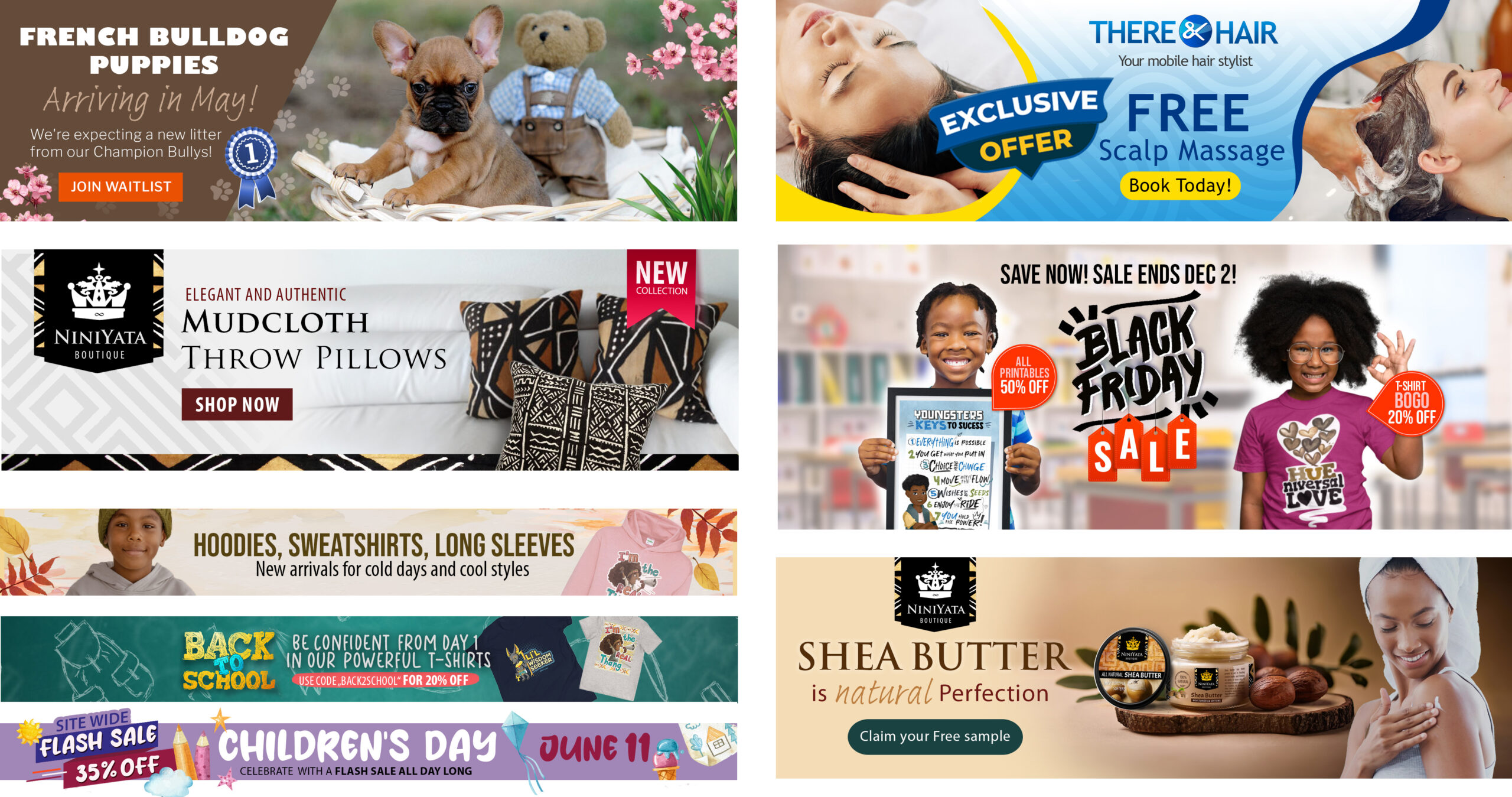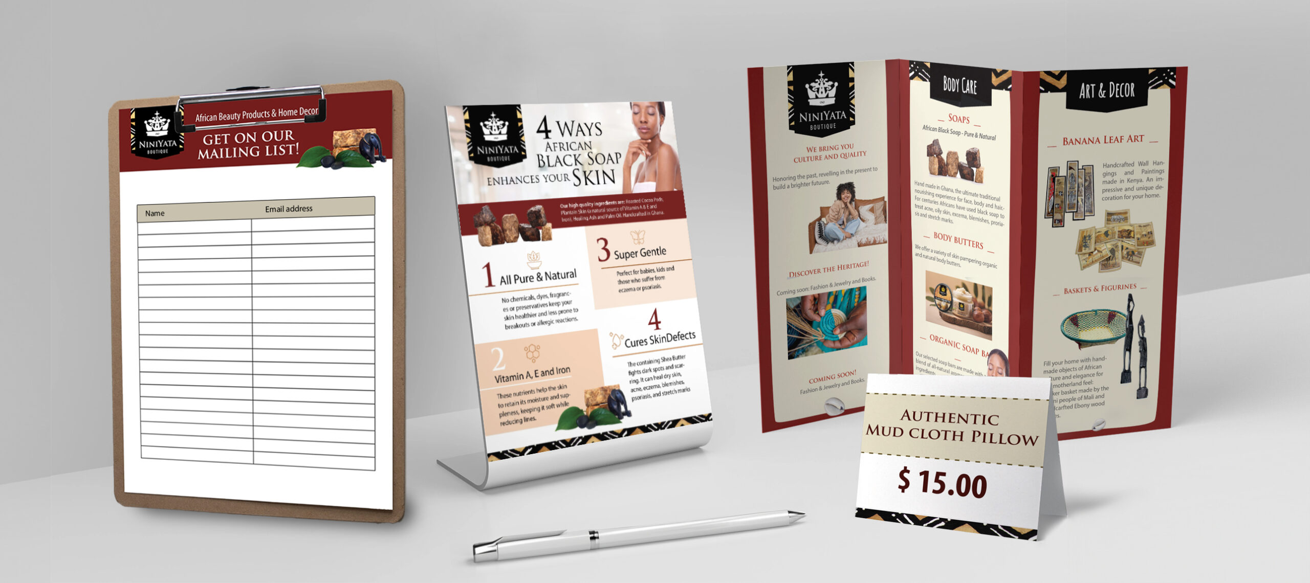 Pop-up shop displays, price tags, and brochures for beauty and home décor boutique Niniyata.